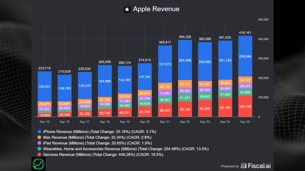Apple’s recently wrapped fiscal 2025 (12 months ended every September) was the start of a more earnest iPhone upgrade cycle. Apple Intelligence may not be much of a hit, but the 17th generation iPhones are selling very well. There could be more upside in the company’s biggest revenue segment as a result ($210 billion in iPhone revenue in fiscal 2025, the highest since the $205 billion reported in fiscal 2022).
